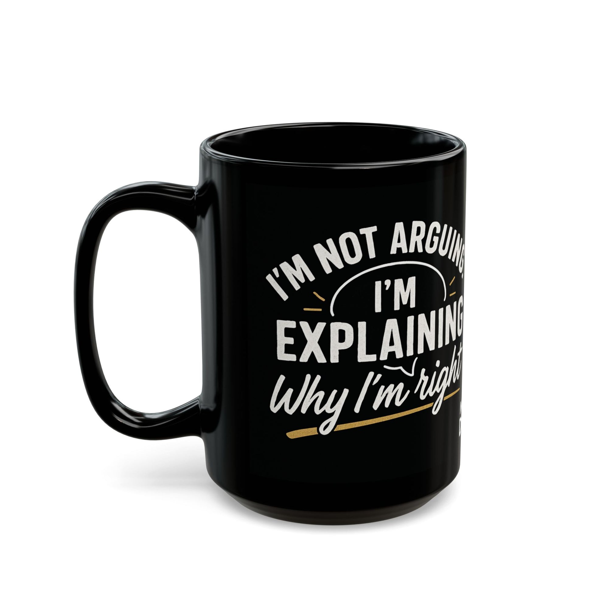 A glossy black ceramic mug that speaks with personality. Bold white and gold lettering wraps the surface with a cheeky message — “I’m not arguing. I’m explaining why I’m right” — giving every sip a moment of humor. The rich print pops against the deep black glaze, letting the design stay vivid through daily use. Comfortable C-shaped handle and two size options make it a steady companion at the desk, the kitchen counter, or during evening wind-downs. Durable, microwave- and dishwasher-safe, and made with lead- and BPA-compliant materials for everyday practicality.